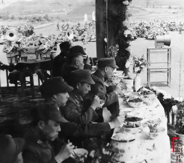1946年4月,蒋介石于青年远征军第六军阅兵典礼后,与杨森等人在典礼台共进午餐。