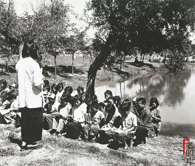 20世纪40年代,山东沂蒙山区某地的小学生在野外上课。时在初秋,孩子们拿着课本,拎着板凳,来到水塘边,整齐列坐,听老师讲课。