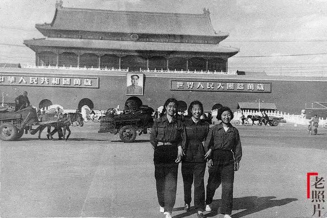 20世纪50年代初,天安门广场地面干净平整,三位工人模样的姑娘欢笑地走来,背后的长安大街上马车和自行车在来往穿梭。