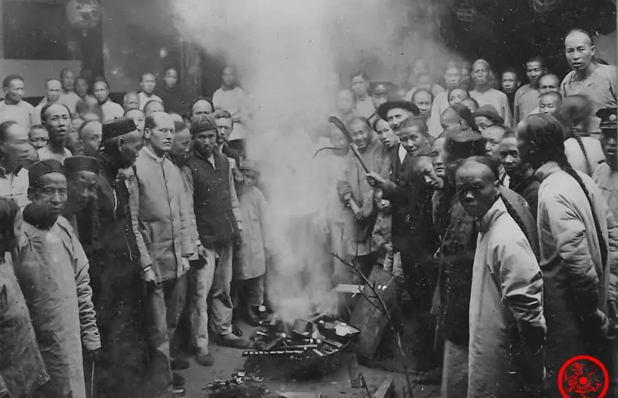 这热闹的场面正是晚清禁烟行动之一,照片里成堆的烟枪被扔到火堆上,烟雾和人群混作一团,有人低头盯着火,有人还伸手往火里添烟具,表情里带着既想瞧热闹又怕被牵连的复杂劲,身上的长衫、马褂一拉,立马就是那个年月的味道。