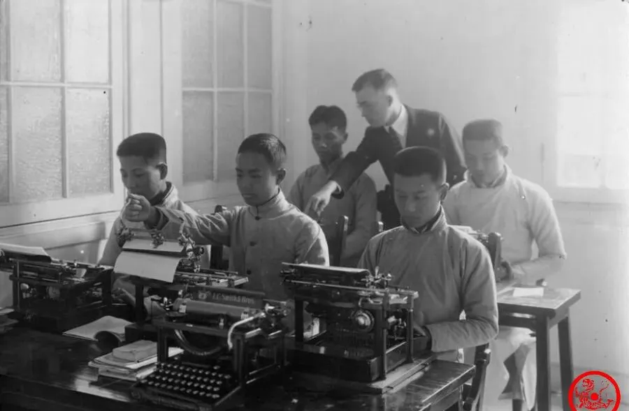 这个屋里一排男生坐得端正,桌上全是英文打字机,老师站身后还是个洋人,照片里透着股稀罕劲,谁能想到上世纪一开头,学生就已经开始敲键盘练手了,这玩意那时候堪比稀罕宝,操作起来一只手扶纸一只手敲,哒哒作响,屋里落地有声。