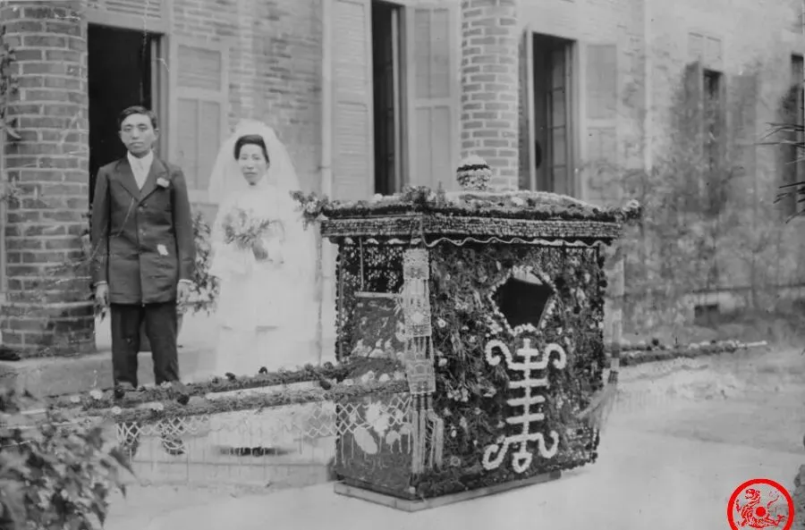 照片里一对站在花轿旁,男的穿着西装,女的披着洁白婚纱,但旁边大大的花轿和一个红艳艳的“喜”字,看得出来新旧交融得正巧,这新娘家里估计是舍得下本的,婚纱是洋气头一份,轿子却还是地道福州做派,一开门整条巷子都跟着热闹。
