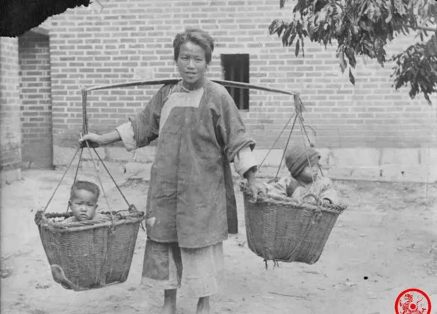 图上的场景硬生生能把人拉回泥土气里,这个女人肩头架着一根老扁担,两头大竹篮里呆着两个小孩,她赤了脚,脸晒得黢黑,衣服掩不住身上的瘦骨,家里要干活没人看孩子,全靠一根扁担把天塌下来的责任一起挑,孩子坐在篮里东张西望,手里抓着草根或者小玩意,母亲只盯住脚下那条土路,身后就跟着搓泥的、哭闹的、打盹的。