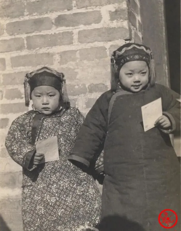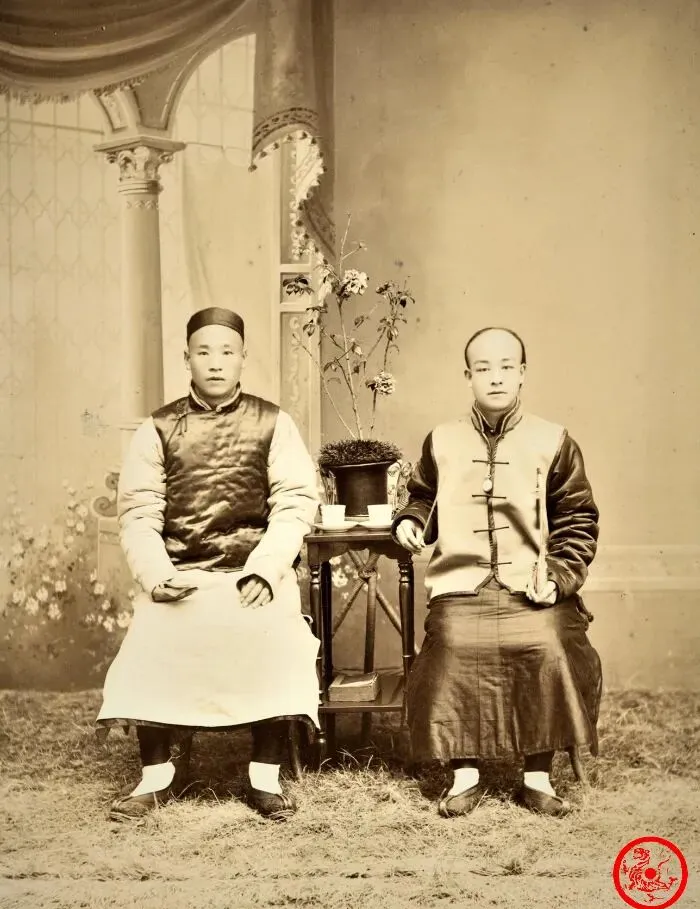 这个摆拍的场景一眼就能看出来是英光阁的手法,图中穿长褂马褂的两位男子,正襟危坐,脚踩老布鞋,衣袖雪白,身上一层软光像是常年摩挲出来的油润,桌子上放着两只茶杯和小花盆,连背景帘子都透着讲究,那时候照相是件大事,得穿上家里最体面的衣裳,家人叮嘱衣角别皱,头发也得抹平顺,等胶片咔嚓一声,才算定格在时光里,照片摸久了边角都发卷,样子依旧透着认真劲儿。