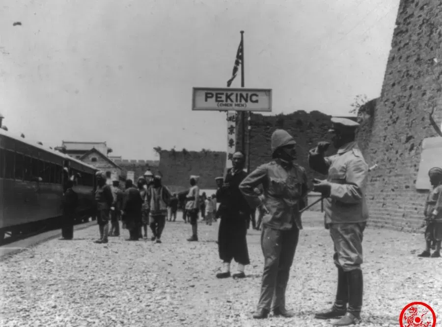 这张照片里的火车站场面简陋得很,招牌写着英文PEKING,大栅栏外人来人往,旁边英法兵各自站着攀谈,一身军装,帽子边缘都泛白,地上是碎石渣子路,不像现在一水的水泥地,那时候火车真的稀罕,村里谁要是说坐过火车,孩子们都跟着瞪大眼睛问够半天,没人嫌车站土,能搭上便是风光了。