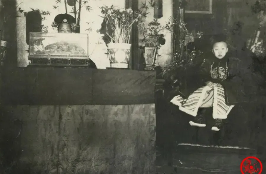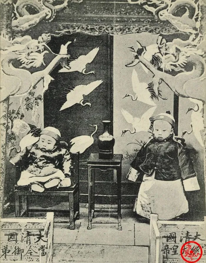 图上的两个孩子就是小皇帝溥仪和溥杰,年纪轻轻正襟端坐在龙椅边上,衣服宽大,帽顶绒球,神色带点茫然,旁边摆着花瓶和绣着飞鹤的大靠垫,小时候还在教科书上见过他们的样子,但真实照片给人的触动不一样,脸上还带着小孩的无辜,这孩子命里多少事都做不了主,几十年一晃,又轮到别人坐那个位子了。