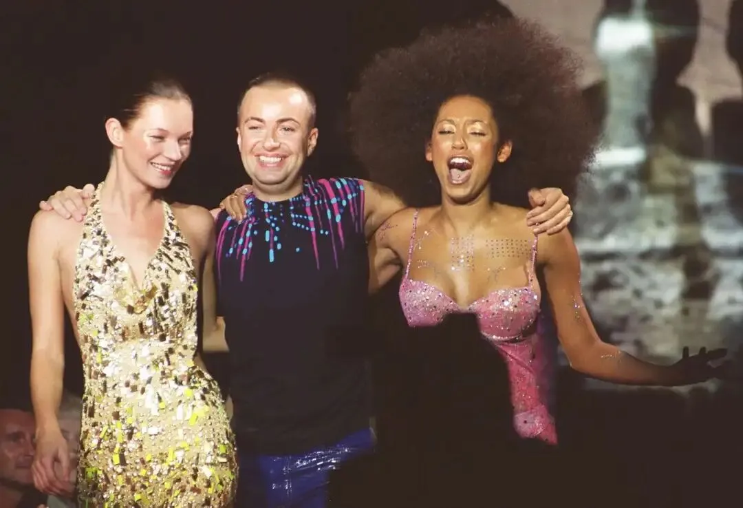 传奇同框:1999年,凯特·莫斯(Kate Moss)、朱利安·麦克唐纳德(Julien Macdonald)与梅尔·B(Mel B)亮相T台。