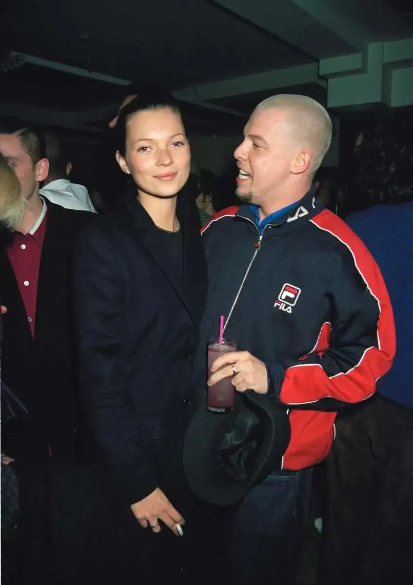 1998年2月伦敦时装周期间,亚历山大·麦昆(Alexander McQueen)与凯特·莫斯(Kate Moss)手拿香烟、身着斐乐运动套装,现身诺丁山的一家药妆店。