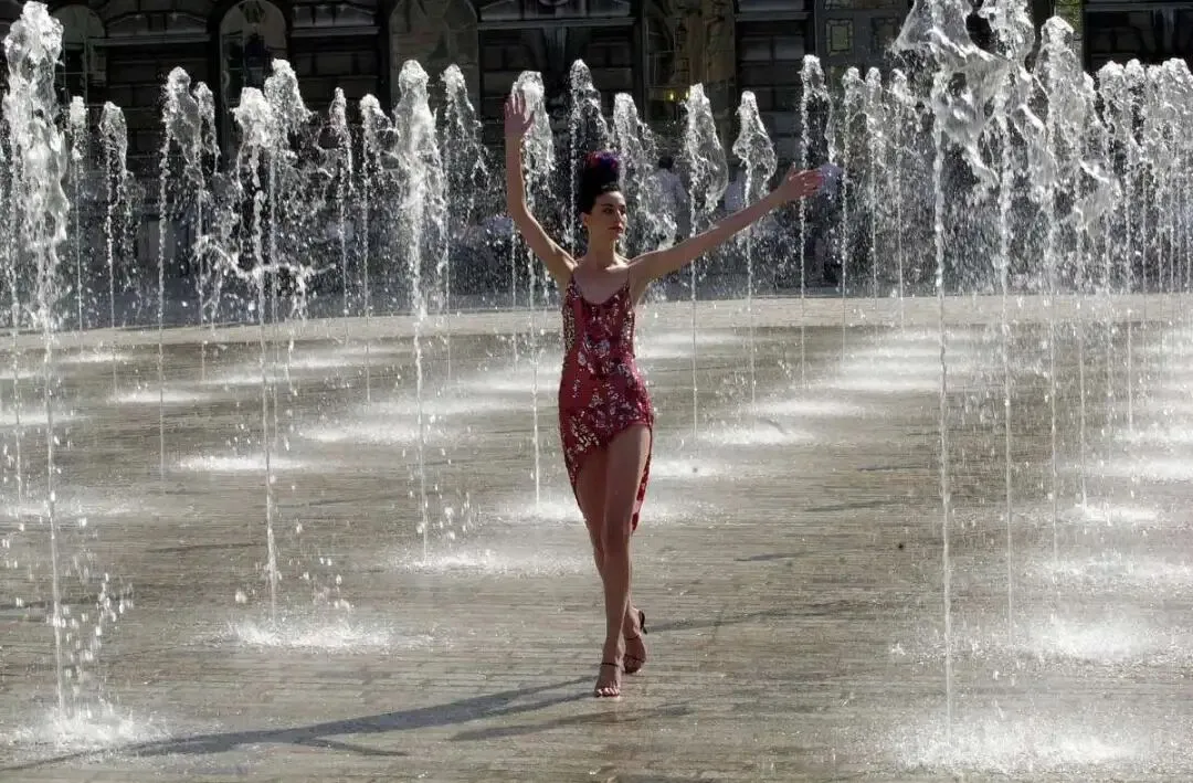 2000年,艾琳·奥康纳(Erin O'Connor)在萨默塞特宫的喷泉旁清凉小憩。