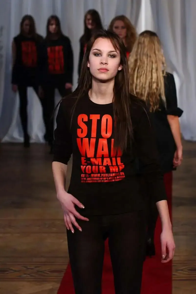 2004年,娜奥米·坎贝尔(Naomi Campbell)以此造型出镜,完美诠释凯瑟琳·哈姆内特(Katharine Hamnett)的核心设计理念。