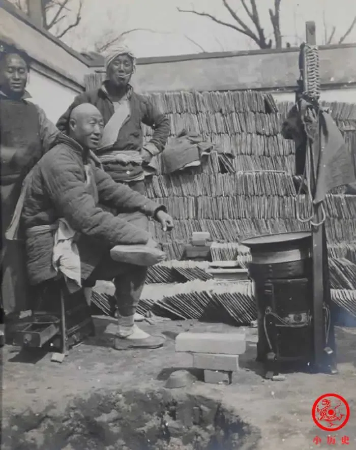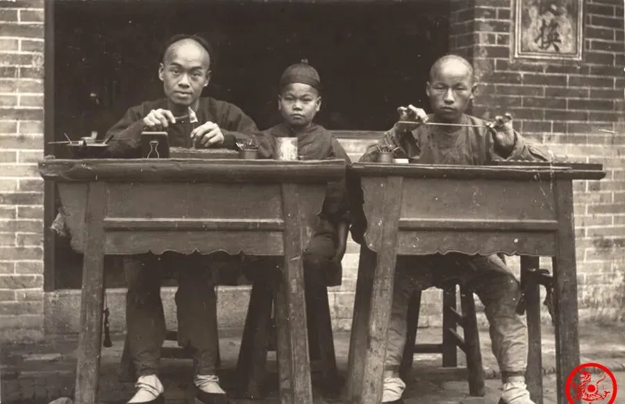 这个屋檐下,桌子一字摆开,两个人埋头捣鼓,图中两位银匠专门敲打银饰,工具散落桌面,谁家孩子坐旁边伸长脖子看,浓眉大眼,板凳磨得溜光,细竹夹子一夹一放,手里那点活儿得拈得熟才敲,小时候路边听叮叮当当声,总想凑近去看,“别淘气,把手缩回去”,母亲拍我一下笑着说,后来银壶银镯收起来,老屋子多了尘土气,匠人的手艺也跟着淡远了。