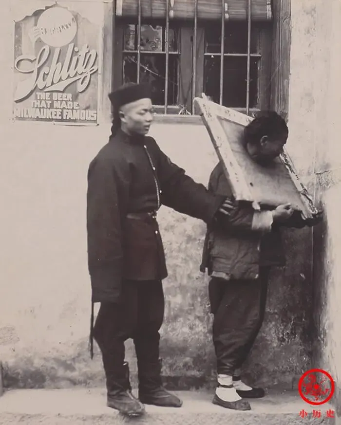 这组里最扎眼的,就数躲在墙角戴着木枷的犯人,脑袋低得埋怀里,死活不肯抬头,捕快搂着肩膀侧身拉他,“快点,对着镜头”,脚下一双布鞋歪歪扭扭,身后冷冷一堵砖墙贴着洋啤酒广告,一幅怪搭,小时候跟奶奶路过衙门口,背后人低头不语,大人悄声嘀咕“做了错事的人,心里头都害怕”,那种沉闷劲放现在,谁还见过。