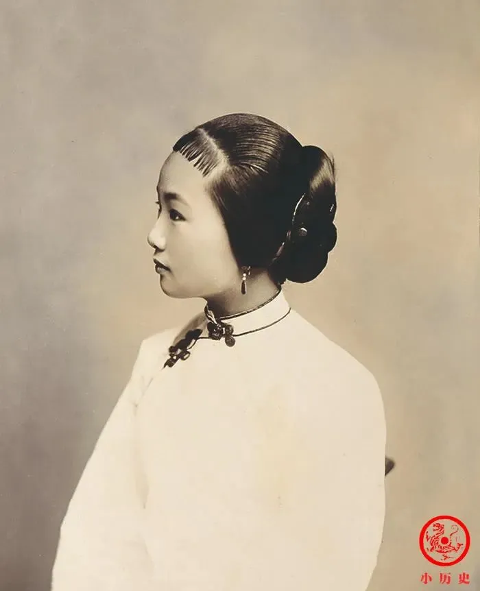 图中这个侧脸出镜的女子,头发一丝不乱,额前刘海贴得像新剃的,每根发梢都压得服帖,发髻盘得讲究,下巴线条流畅,耳坠小巧,脖子上一根细细的银链子,整个人显着安静、利落,妈妈最喜欢留这种发型,“旧社会姑娘啊,那个规矩劲不是谁都能学来的”,她边说边在镜前比划,现在大家都烫起卷发来,那个年头的细致劲反而难得一见。