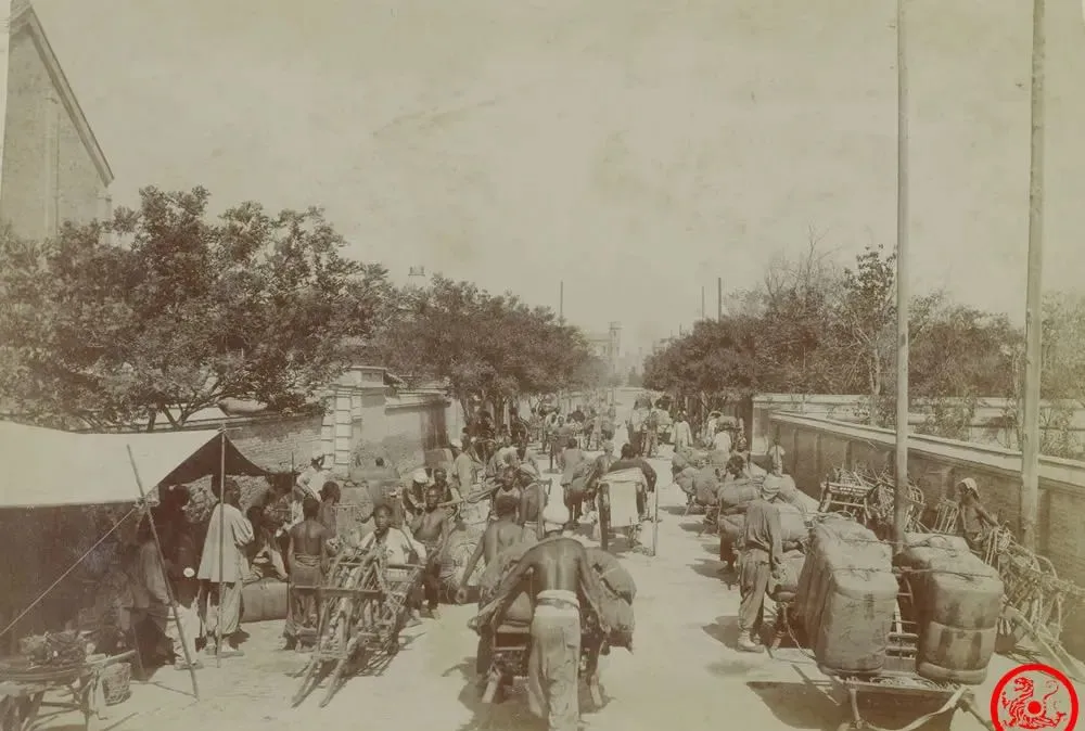 图里排了一长溜的独轮车,这些是天津城里最常见的运输家伙事,车子前头一个大滚轮,两边搭着木架子,绑上大包小卷,推车的师傅们都是光着膀子,胳膊腿子都是干活练出来的,他们走那条街时,后头总是一串汗珠跟着,有时候人多了,整条巷子嗡嗡直响,一辆接一辆推过去,脚边踢起一片灰土。