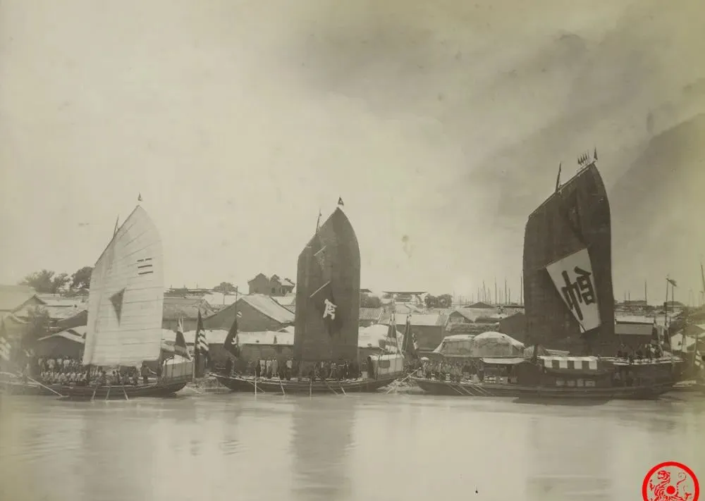 这个画面一看就是天津的海河老风景,最显眼的就是那艘挂着帅旗的大船,听老人讲,这种大黑帆的官船,直隶总督出门时才用得上,李鸿章当年就常坐着走江,看着威风,船上一脚登着几十号人,有专管摇橹的,有敲锣喊路的,三支大旗迎风一甩,老百姓远远一瞧心里就有数,官家来了。