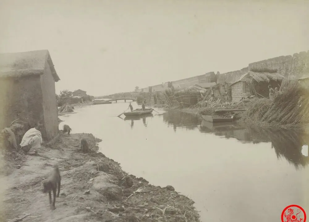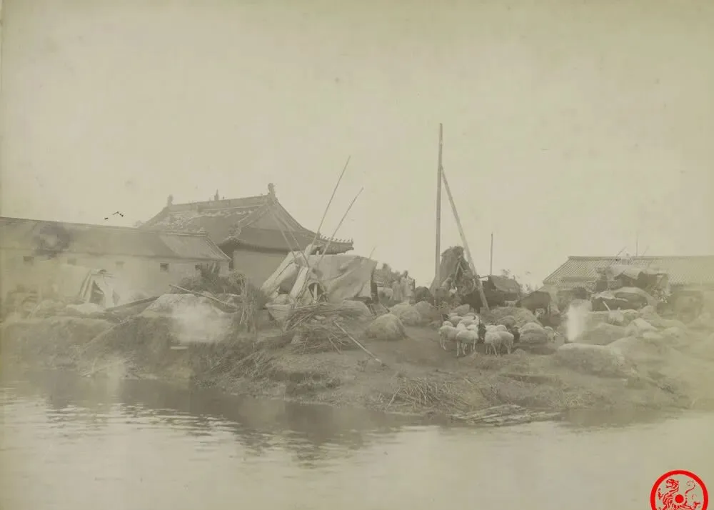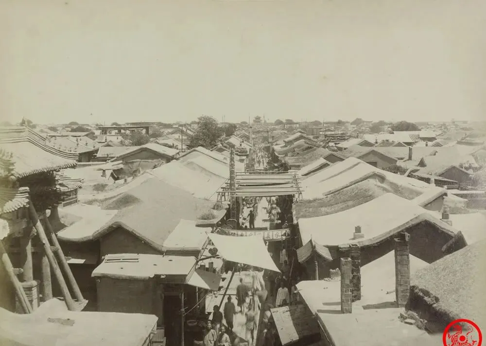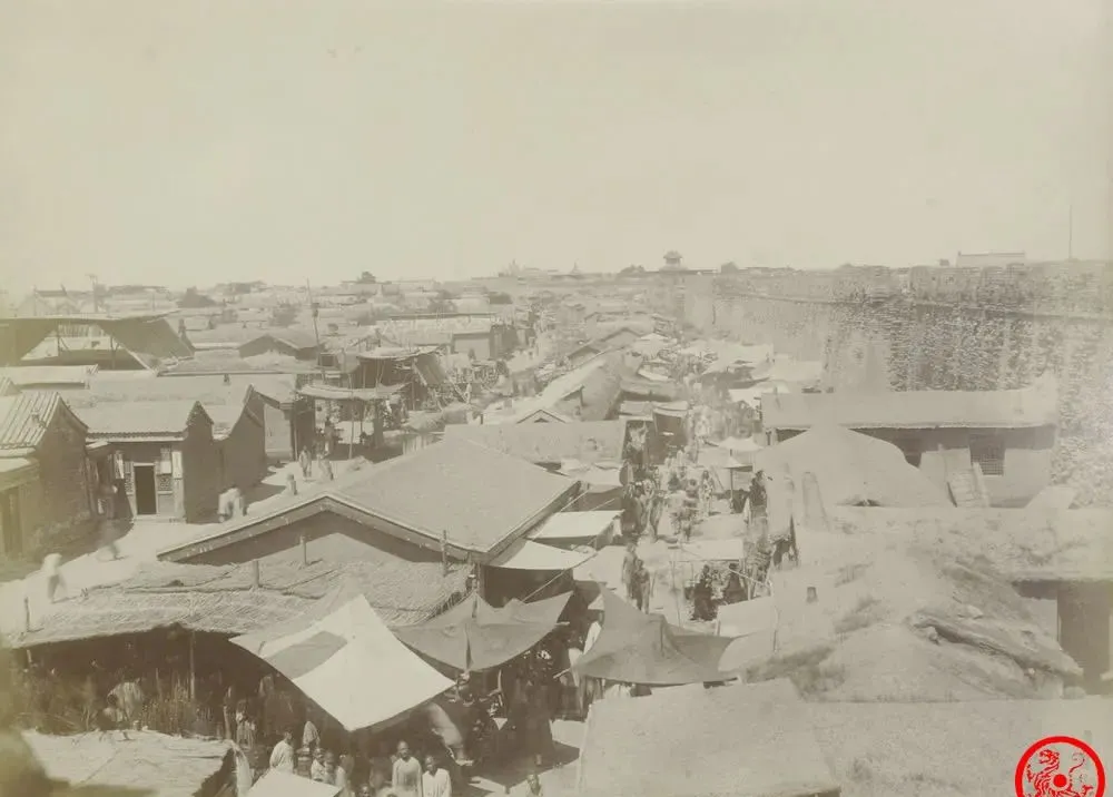 这张就更有意思,天津老城的城墙还在,一旁的屋子错落着,墙根底下站满了人和小摊,有的人牵着牲口,有的搬着稻草,旱地和水沟都混在一块,逢市日那段巷子能挤出汗来。