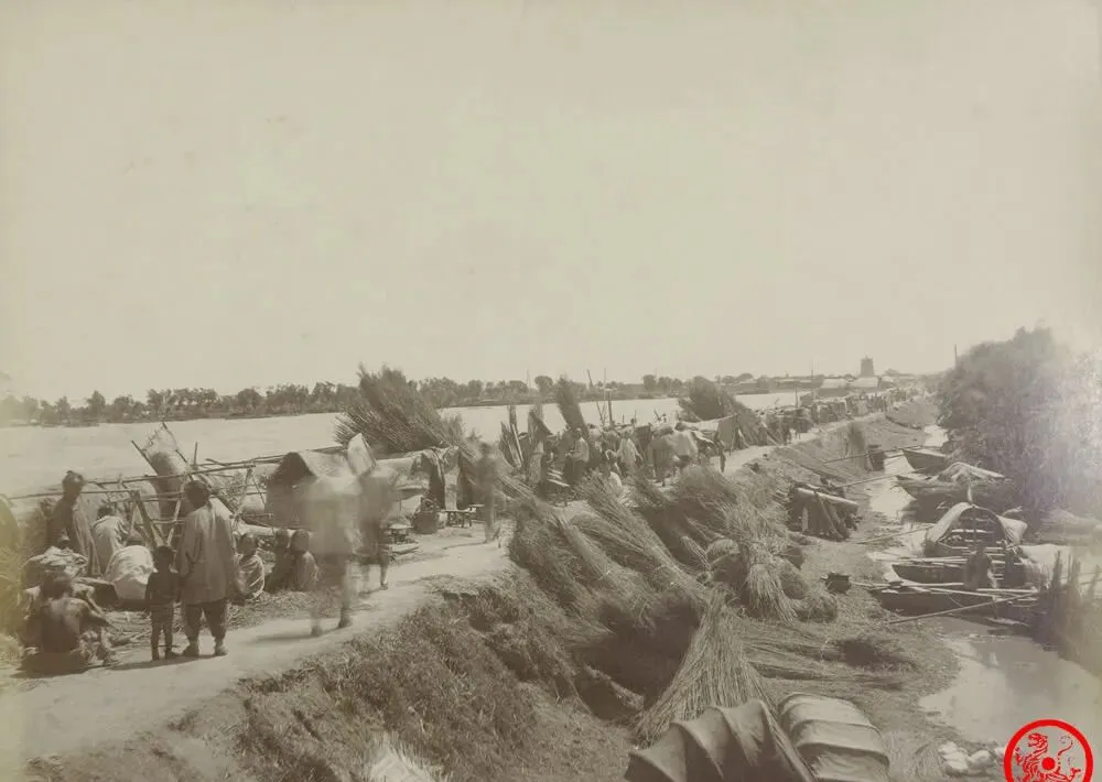 这地方是天津水灾时的堤岸,随便数十来个人往河边忙活,全是背着家什的,男的女的小孩都有,堤上码着一排排柴草、苇子,河里支起竹筏木船,家家户户都得加固自己的窝棚,怕大水一冲就垮。