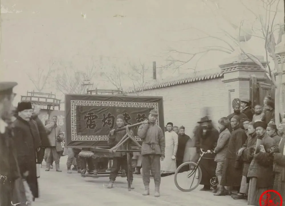 这张是典型的天津牌匾送上门的排场,牌坊边挤满了人,看热闹的、凑趣的,前头两个伙计抬着大匾,上面写着“慈惠均沾”,一改过去小气的门面气氛,背后还有个大字“信徒保障”,大概是哪家信教的给洋人送面子。