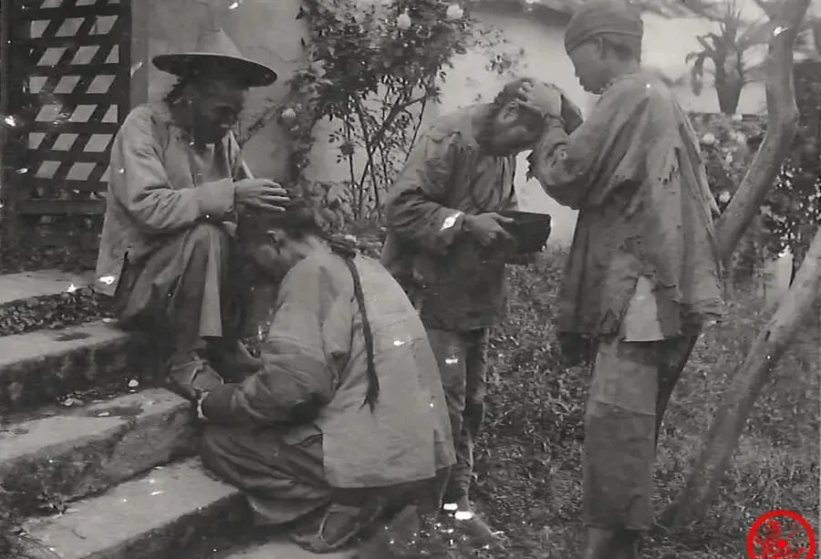 图里几个人蹲着站着,互相帮着寻虱子,穿的粗布衣裳褴褛不堪,有的膝盖、袖口都磨出洞了,头发梳着长辫子,也无心顾形象,只顾眼前一桩桩的活计,那时候洗头水都奢侈,虱子能让一屋子人犯愁,春日院子里,挠头搜虱成了难得的亲近时光,小时候听奶奶唠叨,原来一村人家以前早晨坐在门口就是这么忙活,现在看见谁还敢喊出来抓虱子,哪怕乡下小孩都有洗发水了。