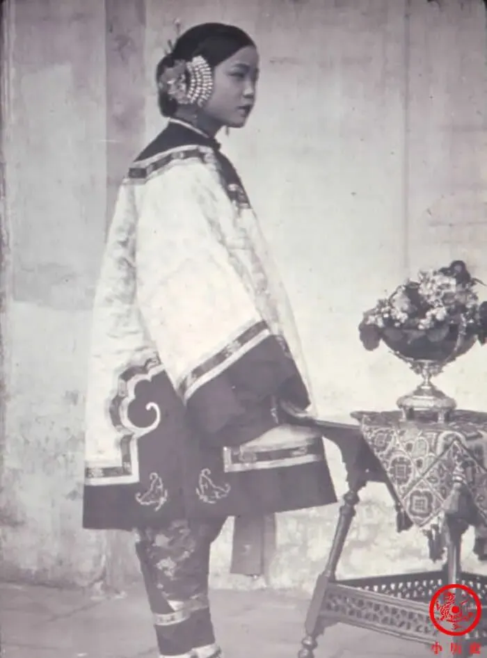 照片中这位女孩子侧着身子,穿着宽肥的袄裤,袖口、下摆都是繁复花纹,头上还缀满珠花发饰,脚底那双小小的绣鞋,十有八九就是传说里的“三寸金莲”,走起路来步子极小,好像随时站不稳似的,奶奶说老妇女最爱和闺女比缎鞋花样,可孩子小小年纪就得裹足,那滋味外人想不到,现在美丑的标准一变,谁还会去折腾这苦楚。