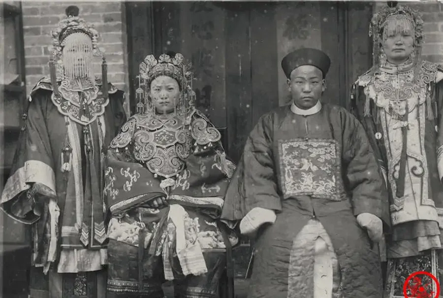 这个场面一眼能认出来是新婚照,新娘凤冠霞帔,头上金步摇垂到下巴,正中坐着的新郎,胸前一块补子,纹路复杂,一看就知道是身穿官服的人,身边的俩女子穿得也喜庆,多半是陪送的姐妹或伴娘,那句“嫁出去的女儿泼出水”,照片里看不到哭,但那年头出嫁就是脱离娘家一步走进另一段人生,家里添人添事,场面都要讲究排得体面,彩色照片估计更热闹。