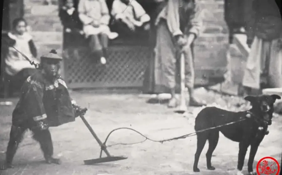 这一张难得有点意思,猴子穿着小棉袄,两爪握着木耙,狗拴在前头,梆梆跑两步就能带着地耕,一群孩子围在墙根看热闹,舞台虽小,笑声满场,小时候我也在城隍庙看过表演,可惜大人摇头说,这东西是用来挣口吃饭的,有的猴子表情比人都细腻,耍一阵子杵地不起了也没人管,过去娱乐物件太匮乏,这样的热闹真能一下让巷子活起来。
