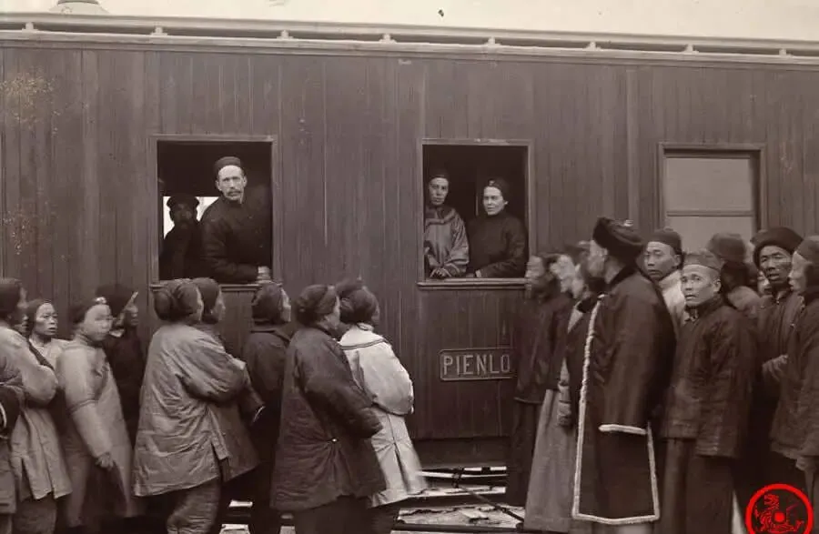 这一节车厢停着,人全挤在窗口,窗户外一圈全是送行的男女,穿着不一,传教士一家一个个着了中式衣裳,孩子安稳地靠着母亲,看不见太多分别的场景,但挤着窗和门的热闹劲一看就懂,有的老人还拄着拐杖,家里人说“外人终究要回家”,那时候外来人扎根一地也不是容易事,走的时候总有百姓不舍。