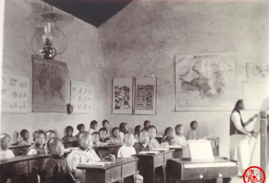 图里这间屋叫初等小学堂,老泥墙、长桌板凳,顶上一盏罩灯悬在正中,墙上的大地图、识字挂图挂得挺规整,师傅手里拿着粉笔,正站着讲课,小孩们坐在桌边,带着点拘谨,那时候读书可不是满大街,能坐进课堂的已经算是村里小福星,别说钢笔本子,桌角那块风琴其实也稀罕得很,七岁入学,修业五年,背书写字,啥都得靠记,难怪有老人一说起那会儿的“开蒙”,嘴边都是“启蒙打底,笨鸟先飞”这几句话。