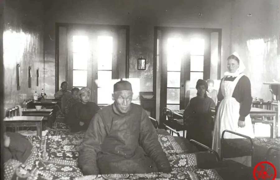 图中这宽敞屋子,是那时西医医院的病房,铺着新花被,病人坐在床沿,旁边是穿白围裙的护士,头上包着一层高帽,这种阵势在当时可是新鲜事儿,有人住院还觉得是稀罕,听老人说,有病大多在家硬扛,也有家属怕进医院花销大,医院为了招揽病号,免费半价都敢出,时不常有带着病人来“新法子”碰碰运气的,病房里静悄悄的气氛,跟大集上的诊脉抓药,全不是一个景儿。
