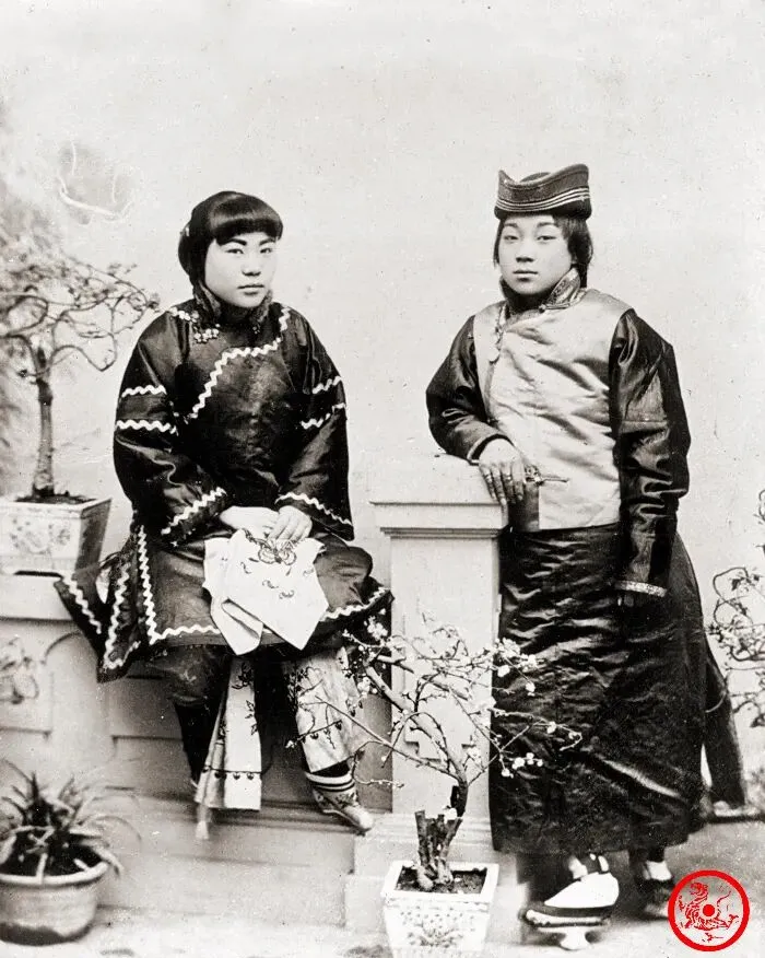 这一左一右,两位穿着考究的姑娘,左边小脚包得紧,右边一身旗装脚放得自然,两个风格对比明显,但脸上都带着一股秀气劲,那时候衣裳样式能看出家庭底子和观念转变,家里老人一看照片就分出谁是守旧谁是新派,“过去攀讲要翻家底看脚,后来才慢慢不讲究了”,确确实实一代人一个活法。