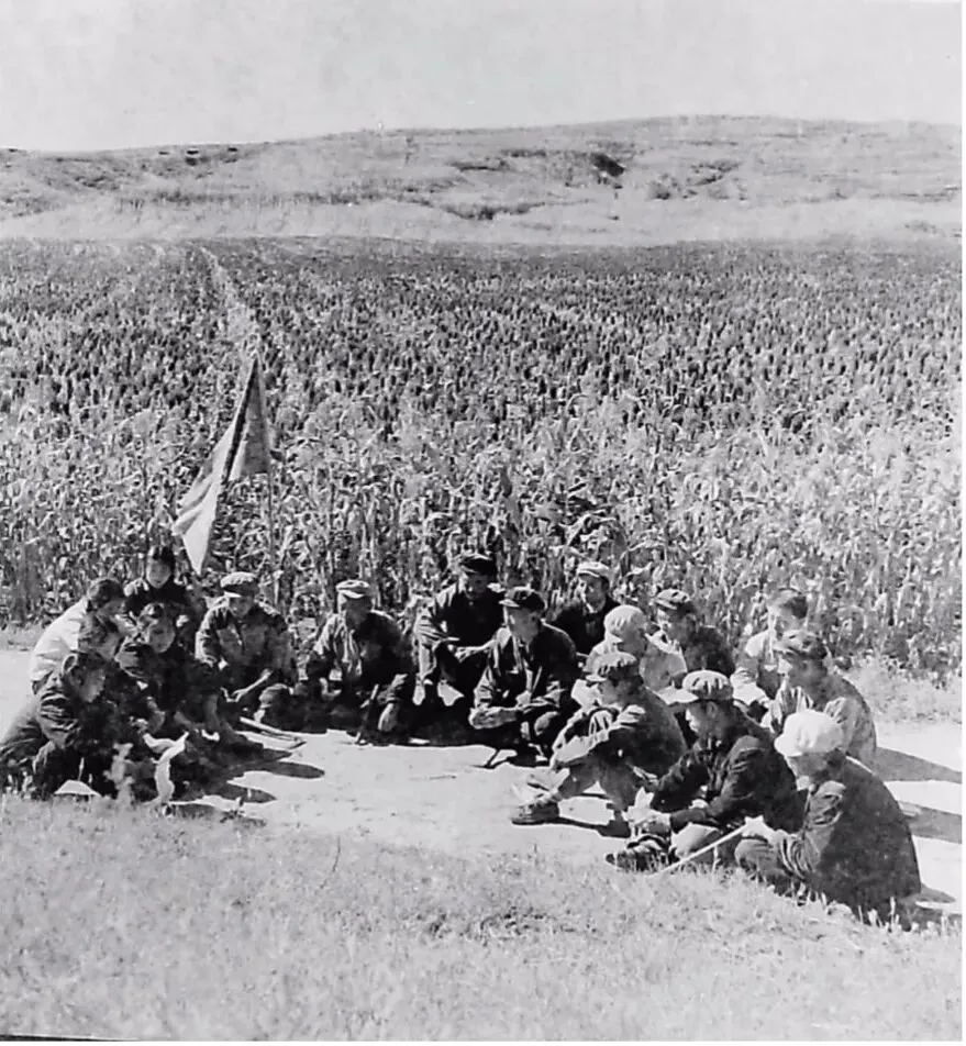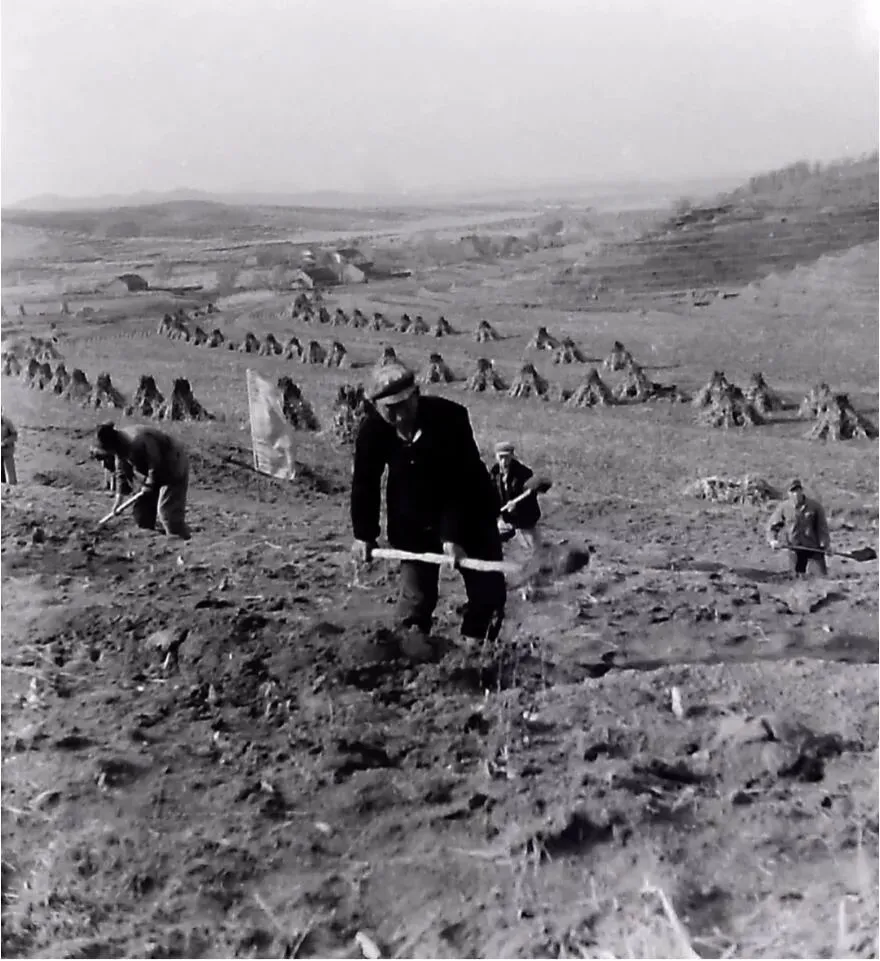 白清寨公社社员发扬自力更生,艰苦奋斗精神,坚决打好农业翻身仗。右二为时任区委书记杨成春。照片拍摄于20世纪70年代。