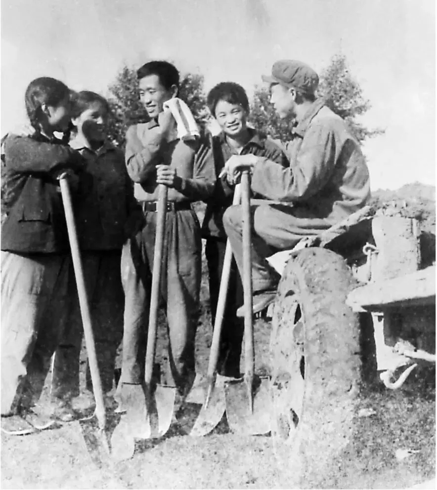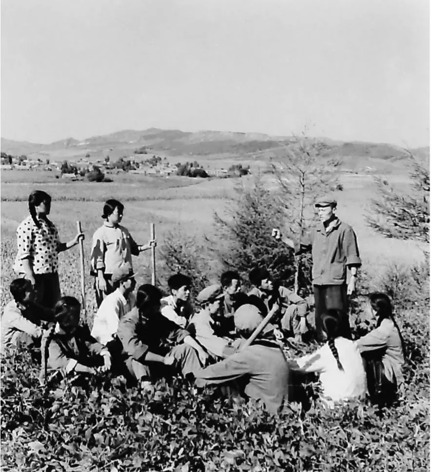 白清寨公社七一大队带队干部和知识青年一起参加劳动。照片拍摄于1975年。