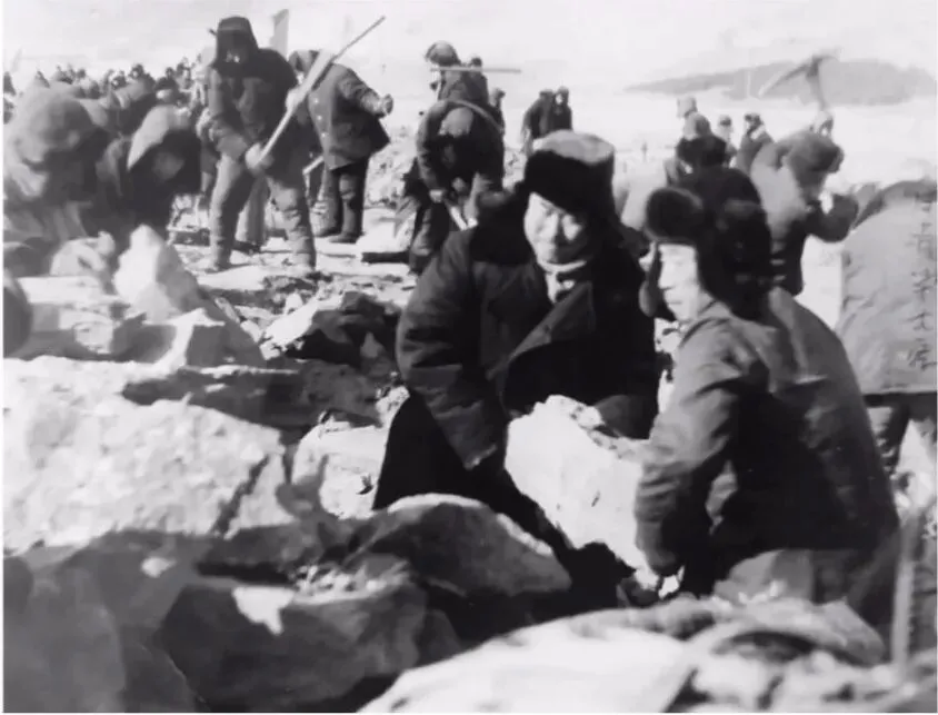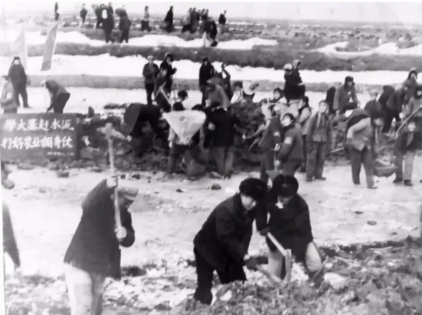 学大寨赶水源,打好农业翻身仗。白清寨公社社员冒着严寒参加农业生产。照片拍摄于20世纪70年代。后面标语上的“水源”是指哪里?