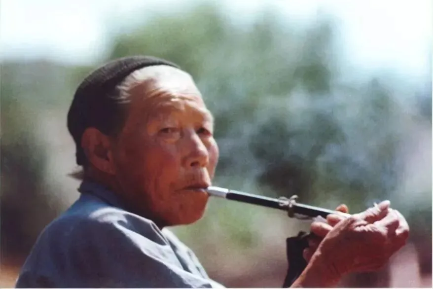 白清寨公社白清寨大队80多岁老人手拿大烟袋,还保持着传统的抽烟习惯。照片拍摄于1979年。