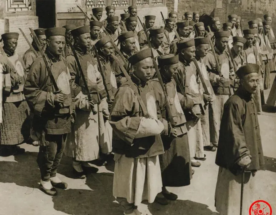 图中排成一队的是晚清的京师警察,穿的是深色袍褂,胸前大大一个补子,脑袋上顶着幞头,手里握着长刀或木棍,样子和绿营兵差不了多少,警徽倒没有,反倒像进家门口的壮丁,清末巡警刚成规模,这些人巡街查夜,手里家伙是家常利器,没啥枪炮气派。