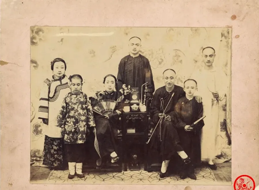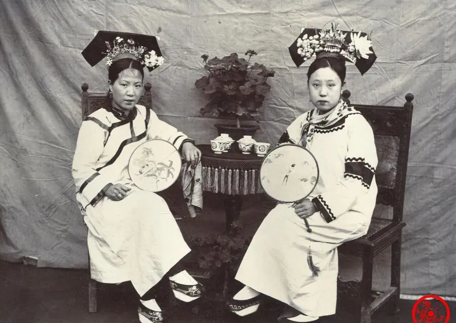 这个雅致的造型是旗人妇女合影,一看脑袋上那个**“大拉翅”旗头**,还有脚下的花盆底儿鞋,就知道来头不小,梳得见高见阔,插满金银珠钗,底下是一身宽松的袍裙,坐在那里,茶盏、摆件、绣花团扇都码齐了。
