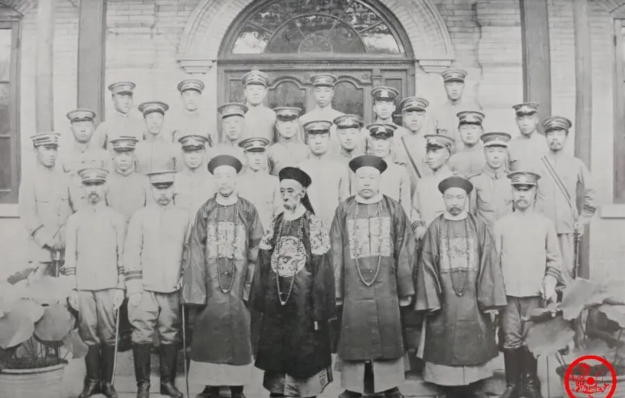 照片里的这群人是陆军贵胄学堂的管学大臣和教官,站一排,文官武将衣服分得明明白白,最显眼的是前头那位,朝服上挂着流苏,珠串垂在胸前,帽顶还嵌宝石,后头的学官穿着制服帽,每个人鞋子也有讲究。