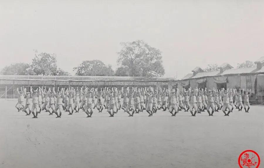 图里这一大片小伙计,正踏着方步做体操,这地方就是贵胄学堂的操场,队伍拉得老齐整,手臂抬起来像收麦子那样齐刷刷,教官一声令下,哗啦啦全动,鞋子踩在地上的声音估计比竹板还脆。