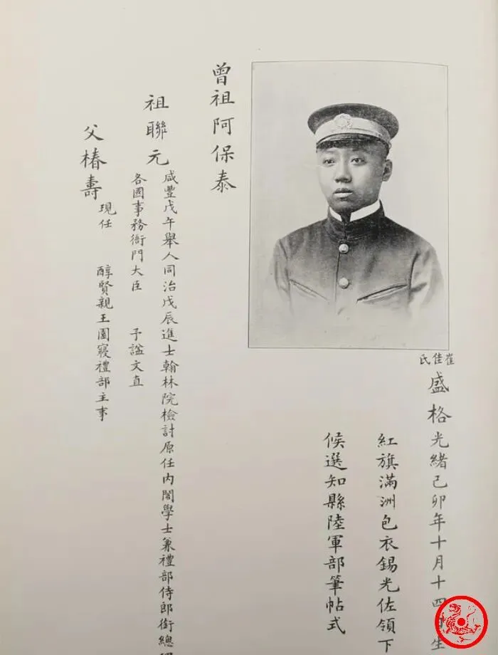 这页整整齐齐写着的叫贵胄学堂学员档案,右面是照片,左边的字一排排竖写着祖上、父亲、本人名字,哪年生,穿的是制服,扁帽扣得正,眼神收着,光一照脸上有点慎重。