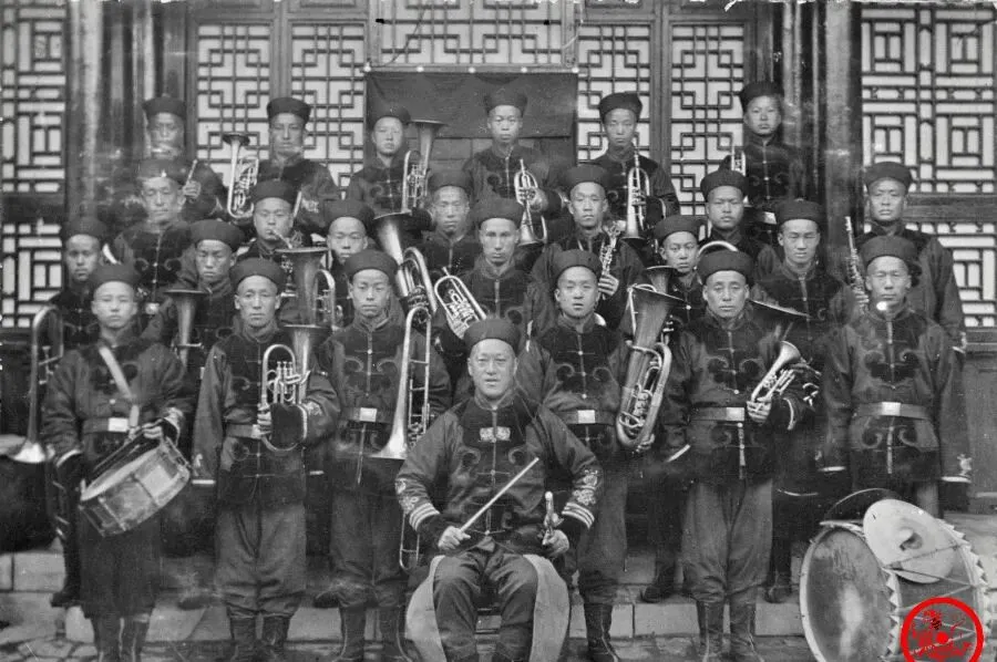 这个阵仗叫袁世凯组建的军乐队,洋气十足,二十人横竖摆开,长号、小号、圆号、鼓,全都抓在手里,个个表情挺端正,坐在中间的老头一手敲鼓槌,另一手抓着指挥棒,这队形比过去吹唢呐的可不一样。