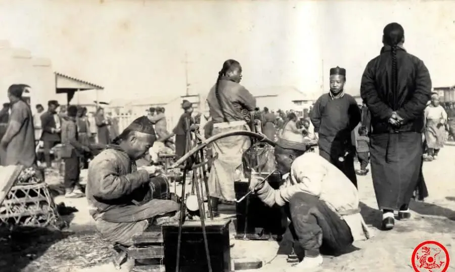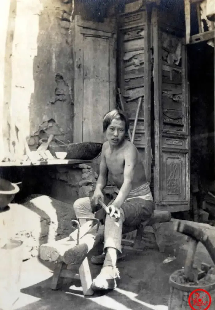 这张老照片上,前头两个男人忙着磨刀修锅,旁边堆着家伙什,世面上有点卡劲的活儿都扔不下他们这种手工匠人,木箱子、煤气罐、长长细细的铁圈子,就靠着这堆简单工具,遇上谁家锅漏了、刀钝了、伞骨子散了,全能摆平,活计虽然粗糙,出来的手艺可不糙,坐在地上一天忙到黑,回头摸弄两口凉饭,腰还直不起来。