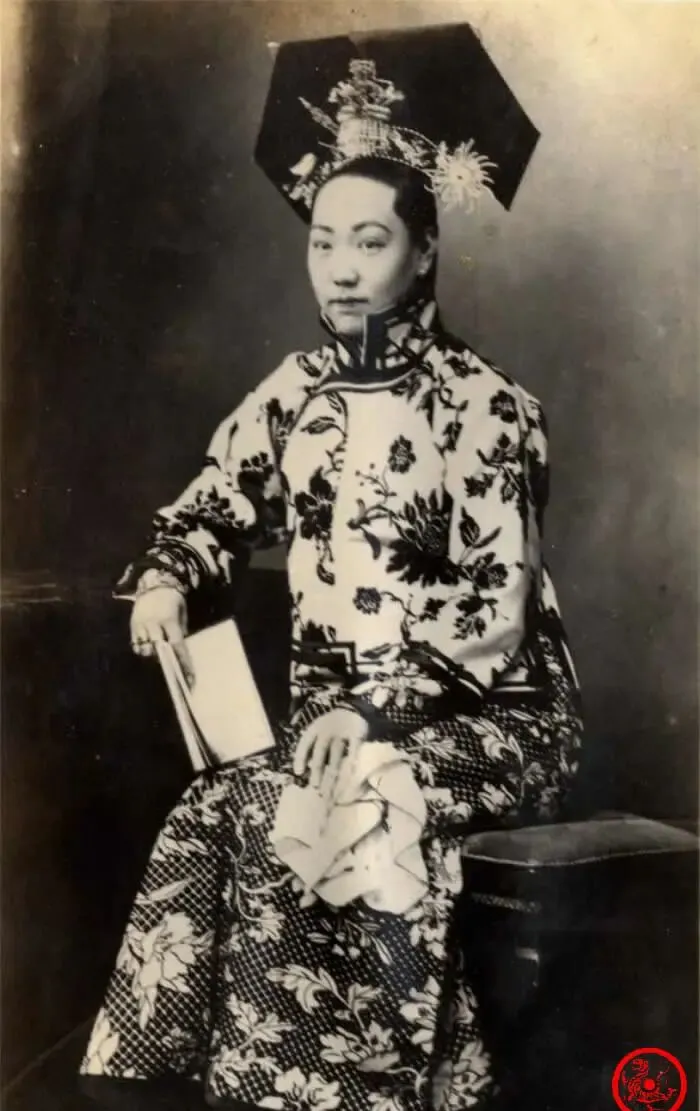 图中这位穿花绸长袍的女人,头上顶着一朵大花一样的“大拉翅”,当年旗人贵妇的派头全都堆在这顶头帽子上,头饰两边咧得宽宽的,像要飞起来,鸦青底子,珠花点缀,一看就是有身份讲究的人。