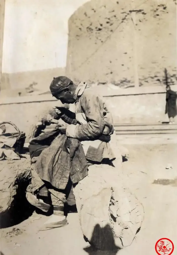 这位在城墙根下蹲着的人,满身灰扑扑的袍子、袖口磨得发亮,一手抓着衣服一手持针,眼神里透着专注,身边摆着装工具的破筐,旧社会缝补衣服的活儿大多让女眷做,有男的干这行,八成路子不顺,就靠这门小手艺换碗饭吃。