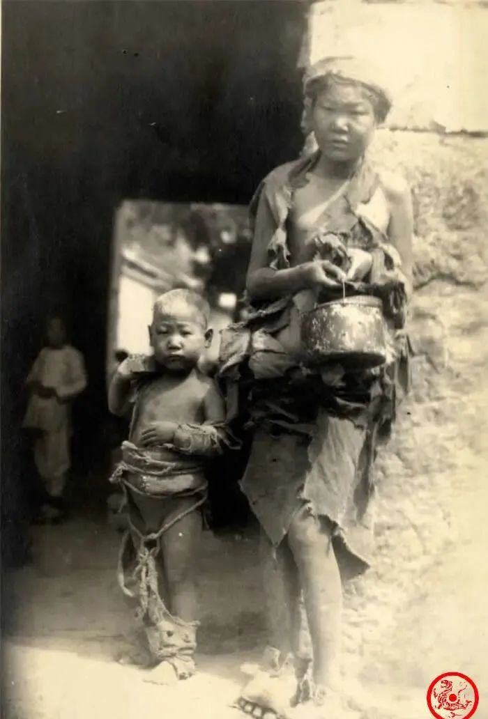 这俩孩子的样子真不忍细看,破烂的布条挂在身上,脚也半裸着,大孩子手里攥着铁皮壶,小的呆呆跟在后头,没精打采,一副风吹来就能倒的样,旧时的北京,这样的情景只要走在街上都会遇见,人活在底层,想填饱肚子都是件难事。