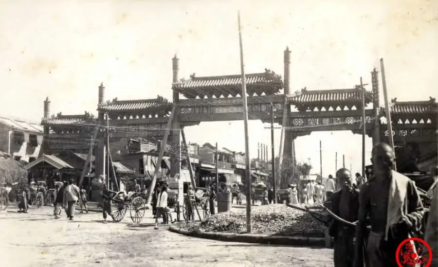 这座五牌楼横在前门大街北端,是老北京的门脸,五间六柱五楼形制讲究,来往人流不息,旧京城有句老话,谁能在五牌楼附近置房,家底十足,楼下满是买卖,小贩吆喝、大户出门、三教九流搅在一处,这地方的繁华,照片里都能闻出来。