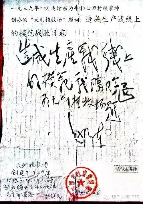 在照片后两排肃立的祖地宗亲中,有“秉坤”“墨林”“棫修”等多位前清秀才,以及“藻山”“抡元”“济洋”等多位新学精英,其中,有两位人物因特殊的历史贡献,让这帧影像更显厚重。二排居中者是前清秀才、开明绅士、心田赖氏族长赖秉坤。1929年,他在坂仔创办天利植牧场,秉持实业救国信念;抗日战争爆发后,天利植牧场成为闽南特委干部何浚等人的隐蔽场所,他还利用自身社会地位和影响力,争取国民党保甲长对抗日事业的支持,秘密为游击队输送物资,为抗战胜利作出重要贡献。1939年,其长子赖国民在延安抗大学习时,写信给毛泽东主席,简述天利植牧场支持闽南地下党抗战的情况,并请求为建场十周年题词,获毛主席题赠“造成生产战线上好模范,战胜日寇”。这一珍贵题词成为抗日统一战线的重要历史见证,激励着无数人投身抗日救亡运动。而后排头戴礼帽的赖济洋(阳),此时还是一位目光清澈的进步知识青年。数年后,这位富裕农家子弟在闽南地下党的引导下,以乡绅身份为掩护,秘密支援靖和浦游击区斗争;全面抗战爆发后,他临危受命出任国民党坂仔区联保主任,利用职务之便协助抗日救亡,1940年在东坑村新起楼遭特务暗杀,年仅34岁,于1980年被追认为在抗日战争中牺牲的革命烈士。他的一腔热血,永远浸润着故乡的土地。