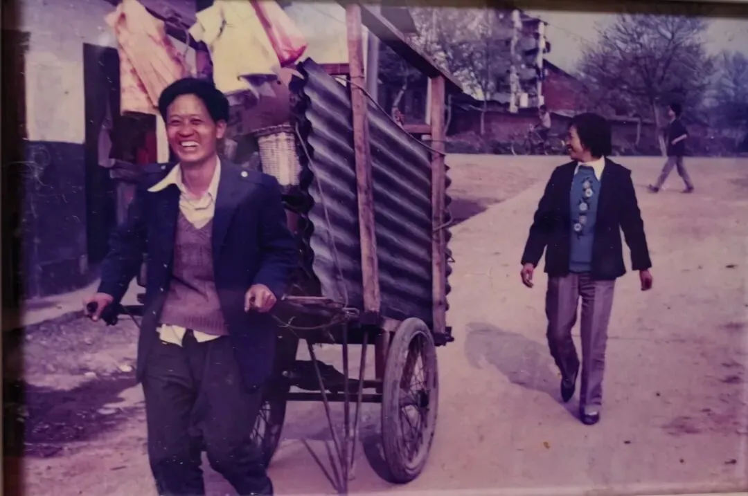 照片里,两个人都笑得格外真切。父亲更是开怀大笑,一口牙齿整整齐齐,不像如今,岁月匆匆,牙齿早已渐渐全部脱落。母亲则眉眼温柔,不知在和谁笑着打招呼,轻快地跟在父亲拉着的板车后面。
