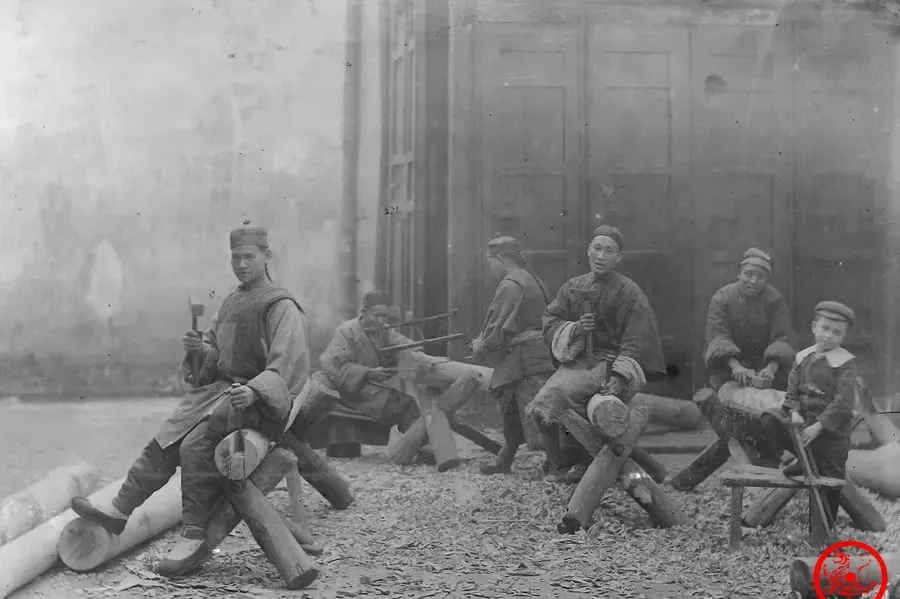 地上全是刨花,木头掰开来压在腿上,五个人各干各的,一个在锯,一个钻榫眼,大伙脸上全是烟灰和汗珠,那边偏还有个洋娃娃站着瞅热闹,八成跟着家长混进来,小时候家里修东西都是请木匠师傅,师傅来了手上带着茧,工具一拉开,“咯噔”全支在地上,爸爸说,这行手上没点真本事,榫头榫尾扣不好就丢人现眼了,和现在家装师傅拎电动工具不一样,以前全凭手劲和眼神,做个衣柜能用三十年不坏。