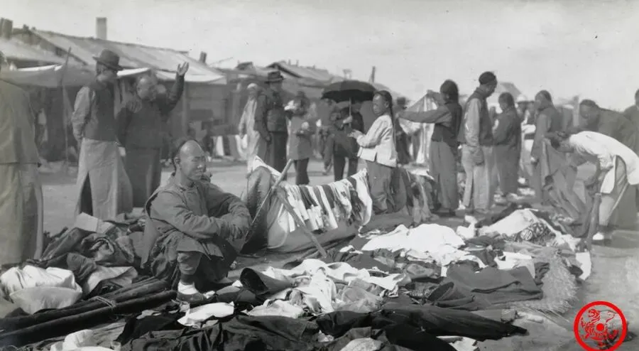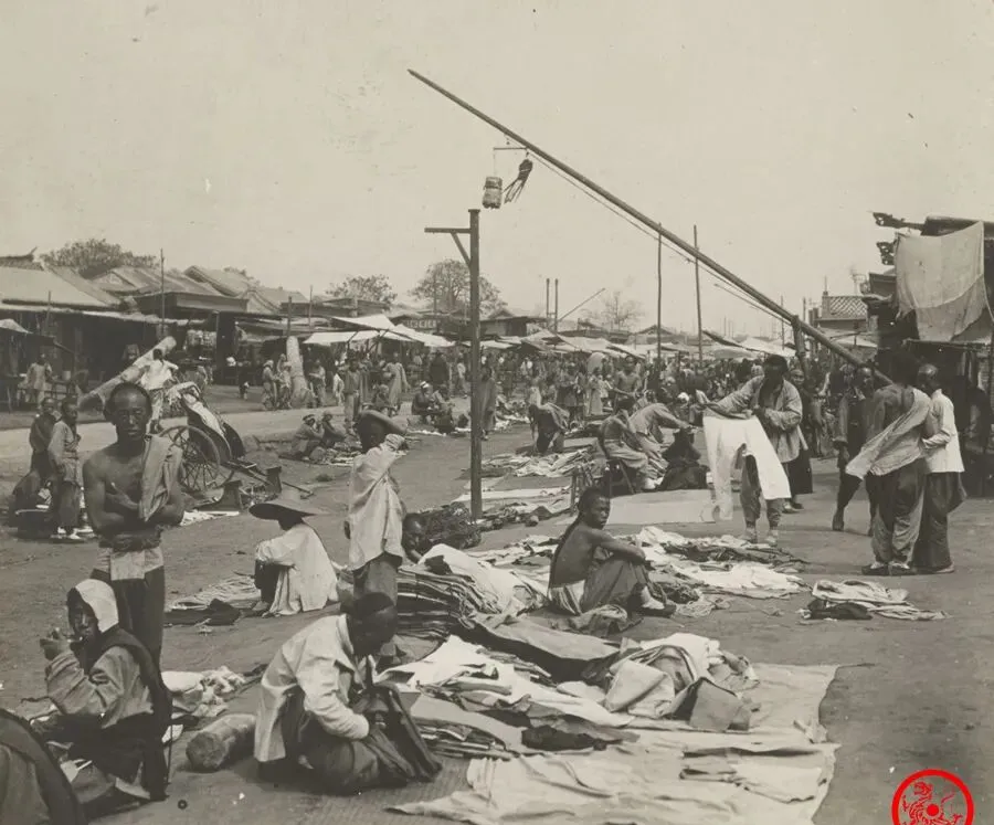 图中这一片铺开的是老北京估衣摊,不拘大街小巷,地上一铺褥子衣服一层盖一层,衣袖裤腿全都歪歪扭扭地撑着,好家伙,真有点“地摊桥头会,旧衣如山堆”的气势,那年头最讲究个实惠,进了秋冷下来,一件二手棉袄能顶全家老小不挨冻,新货谁都知道贵,轮得到的都是刚脱下不久的衣裳,左掂掂右摸摸,看厚薄瞧补丁,手感是糙是细心里有谱,挑出来合适的直接换上,买家卖家没工夫磨叽,天一冷生意就红火一阵。