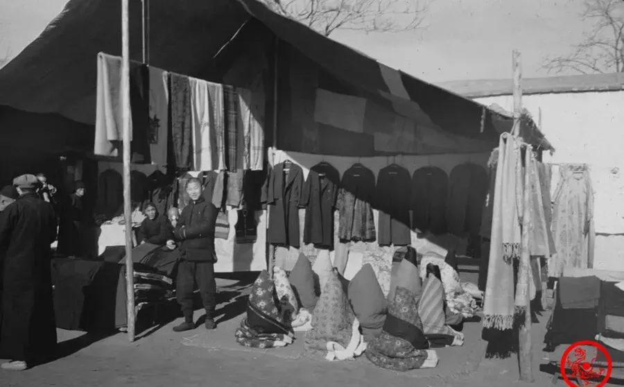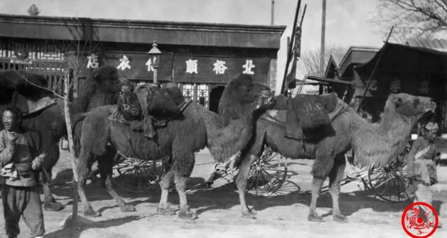 北裕顺门口这一队大骆驼,可不只是看热闹的,当年城里头的布匹旧衣,都是靠牲口这么驮着南来北往送到估衣铺去的,骆驼身上的麻袋里一捆就是一身故事,估衣行里“从北口走商南城,带货一路风沙”的话一点不夸张,大雪天里驮着一包旧袍褂,主家到地儿就能收拾些散碎银两,至于衣物新旧,其实水分可大得很,碰见门道深的行家,开口两句就能听出来底细。